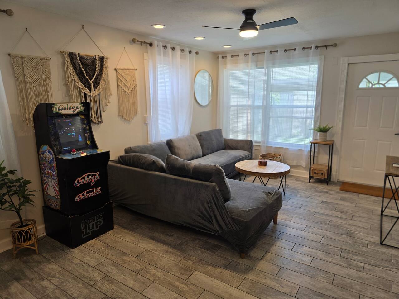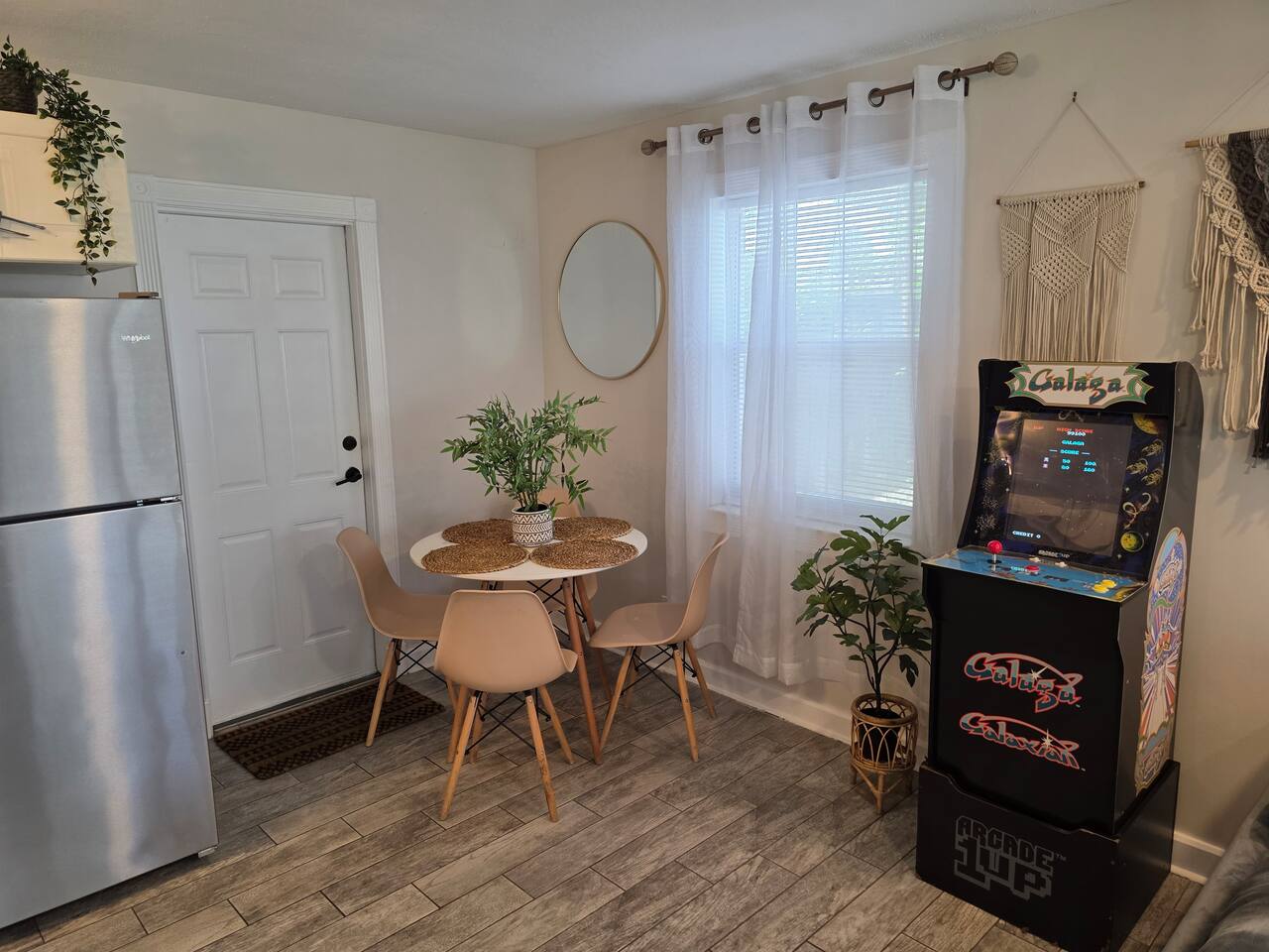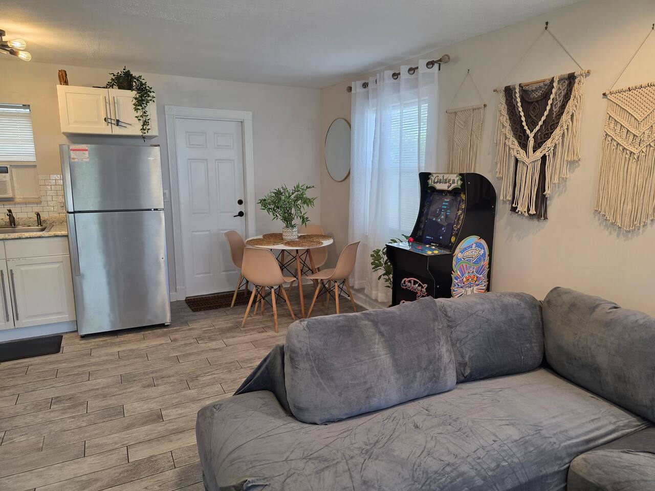 **SPACE WAS RECENTLY REFRESHED AND FEATURES A GALAGA ARCADE GAME** SLEEPING & COMFORT: - Comfortable King-sized bed - Convertible chair that pulls out to a twin-sized bed - Two powerful, individually controlled A/C units - Ceiling fans and dimmable lighting KITCHEN & DINING: - Fully equipped kitchen with pots, pans, and seasonings - Full-sized refrigerator, stove, oven, and microwave - Coffee station with drip coffee maker and french press - Dining table with seating for four BATH & CONVENIENCES: - Full bathroom with a shower and new ventilation fan - Hair dryer, iron, and ironing board WORK & OUTDOOR: - Dedicated workspace for remote work - Fast, free Wi-Fi (426 Mbps) - Gated patio with string lights and seating