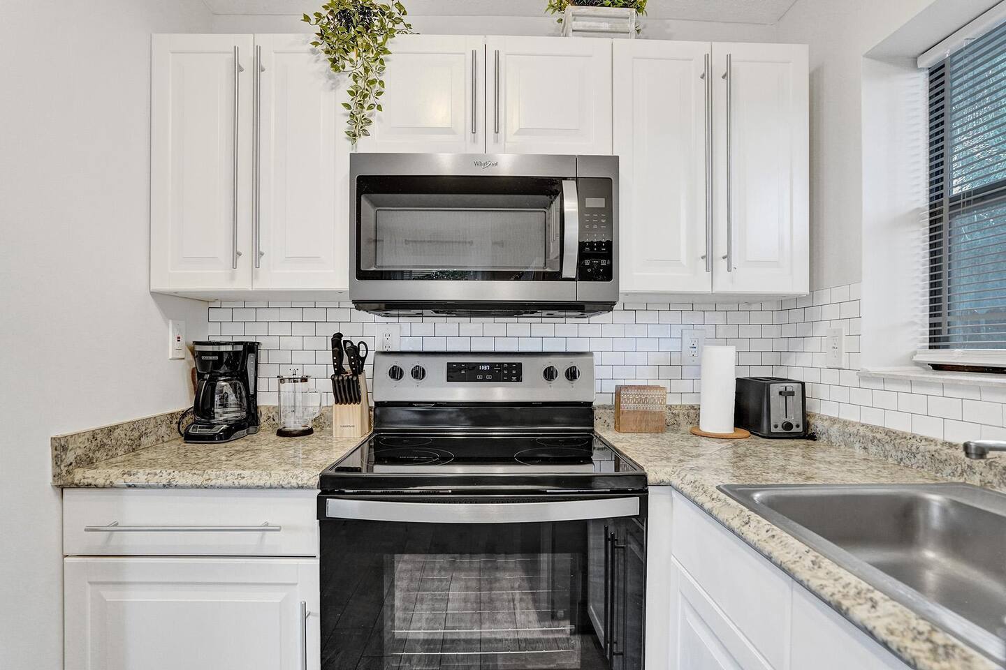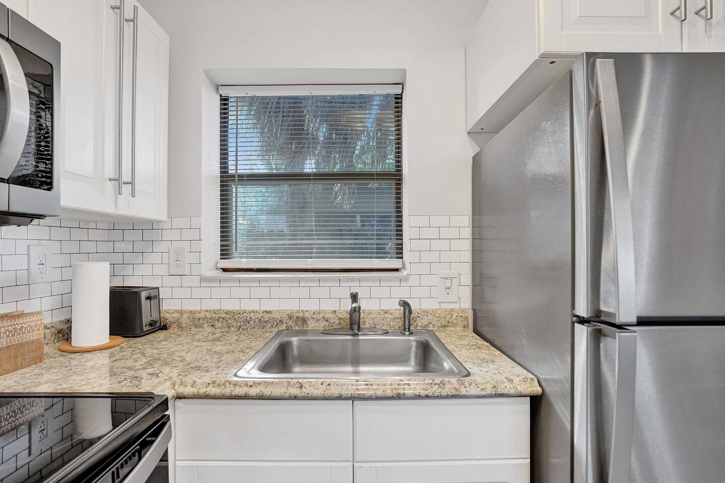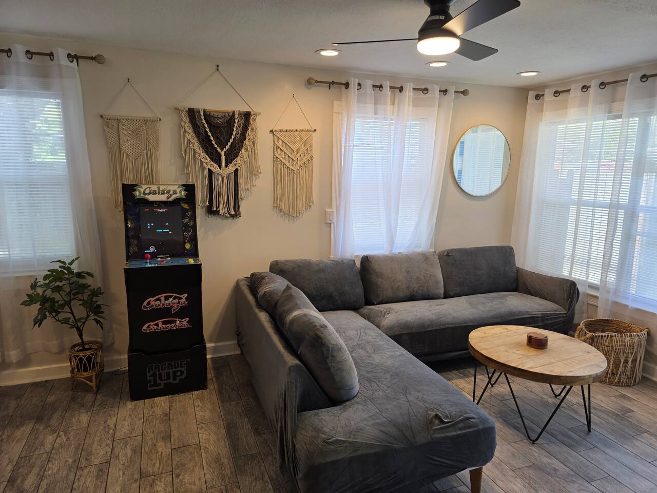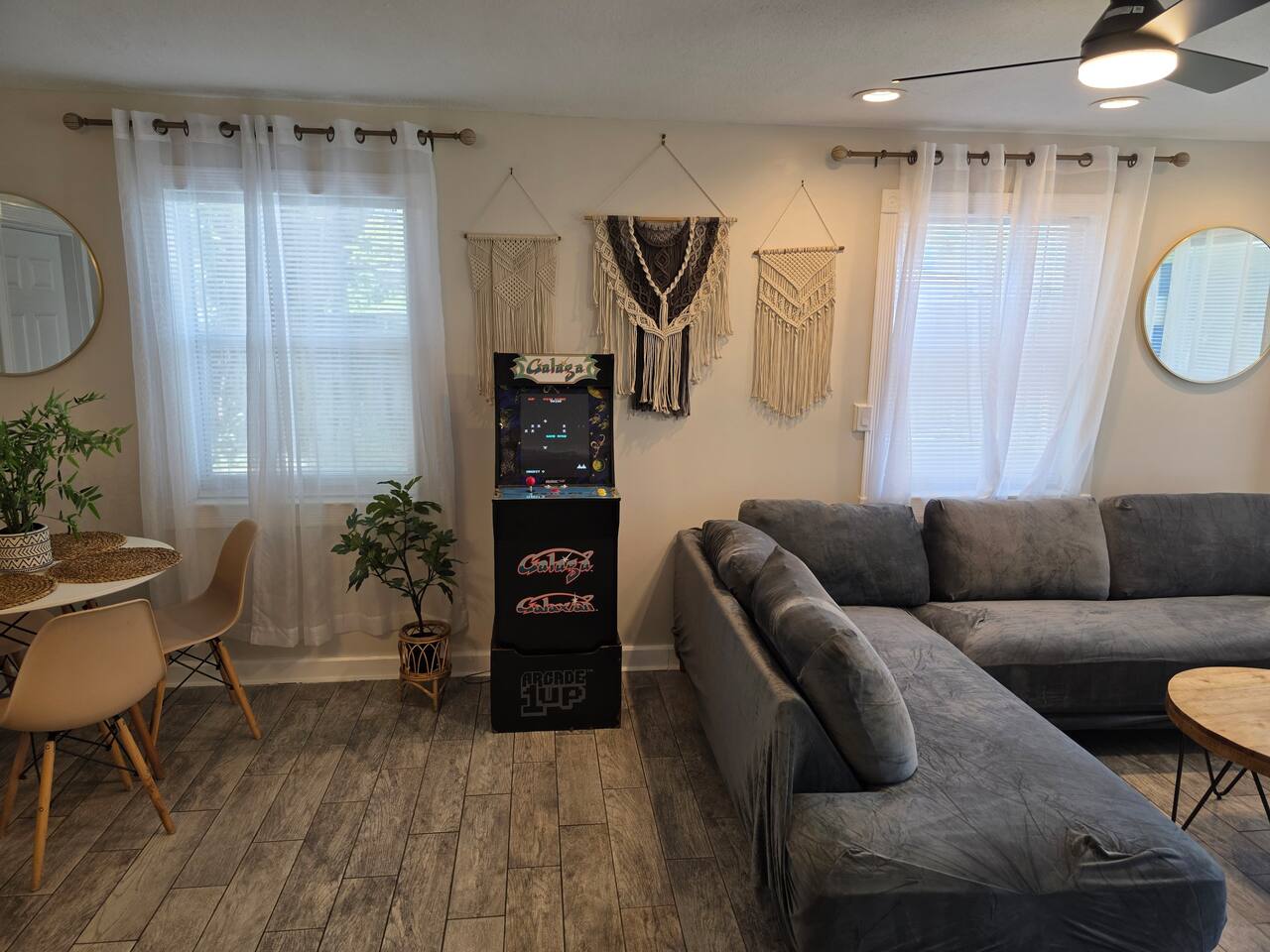 **SPACE WAS RECENTLY REFRESHED AND FEATURES A GALAGA ARCADE GAME** SLEEPING & COMFORT: - Comfortable King-sized bed - Convertible chair that pulls out to a twin-sized bed - Two powerful, individually controlled A/C units - Ceiling fans and dimmable lighting KITCHEN & DINING: - Fully equipped kitchen with pots, pans, and seasonings - Full-sized refrigerator, stove, oven, and microwave - Coffee station with drip coffee maker and french press - Dining table with seating for four BATH & CONVENIENCES: - Full bathroom with a shower and new ventilation fan - Hair dryer, iron, and ironing board WORK & OUTDOOR: - Dedicated workspace for remote work - Fast, free Wi-Fi (426 Mbps) - Gated patio with string lights and seating