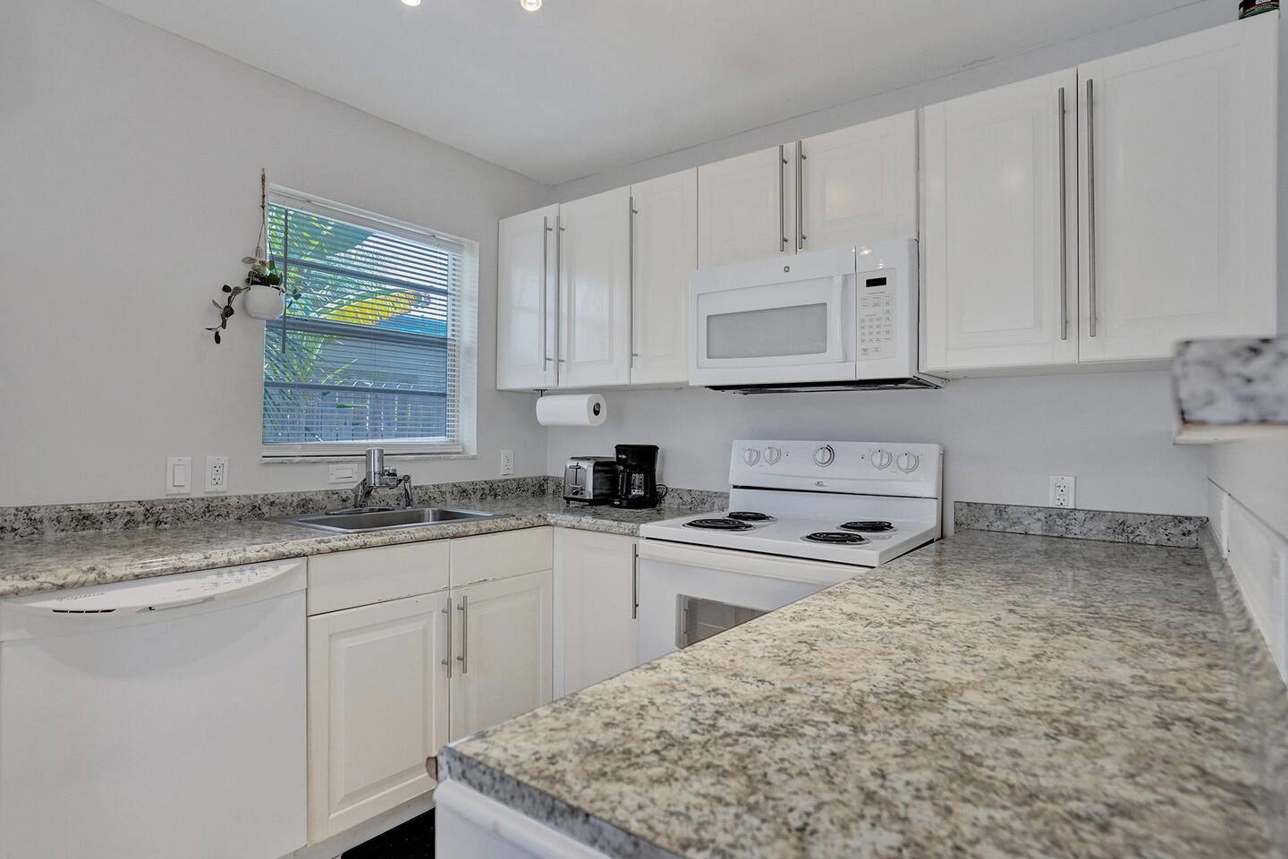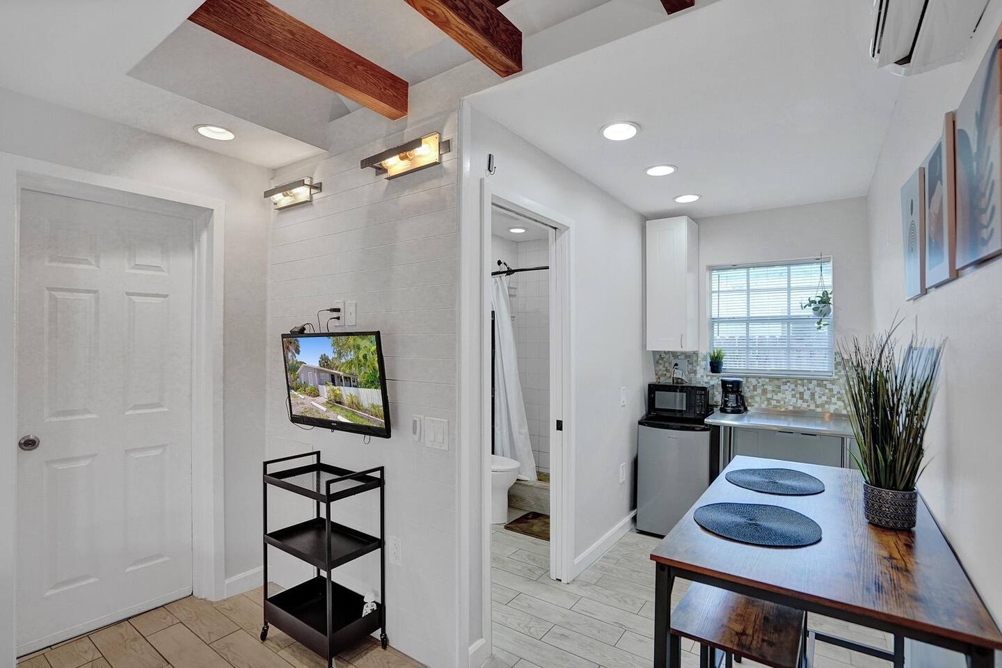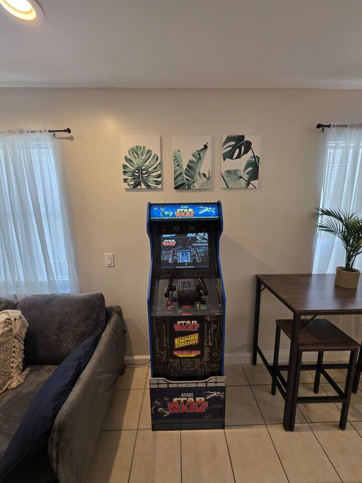 YOUR PRIVATE COMPOUND INCLUDES: 3 Private Suites: (1 King Suite, 1 Queen Suite, 1 Queen Studio), each with its own private entrance and A/C. 3 Full Bathrooms: Stocked with essentials. No need to share! 2 Full Kitchens & 1 Kitchenette: Including 2 full-sized refrigerators, 1 mini-fridge, multiple microwaves, and coffee makers. 3 Living Areas: Each with its own Smart TV with Roku. Multiple Sleeping Options: 1 King bed, 2 Queen beds, 1 convertible chair (twin bed), and air mattresses available to sleep up to 8+ guests. Shared Outdoor Oasis: A large, gated patio with string lights, comfortable seating, and a BBQ grill area. Work & Conveniences: Fast Wi-Fi throughout, dedicated workspaces, and free on-site parking for up to 8 cars.