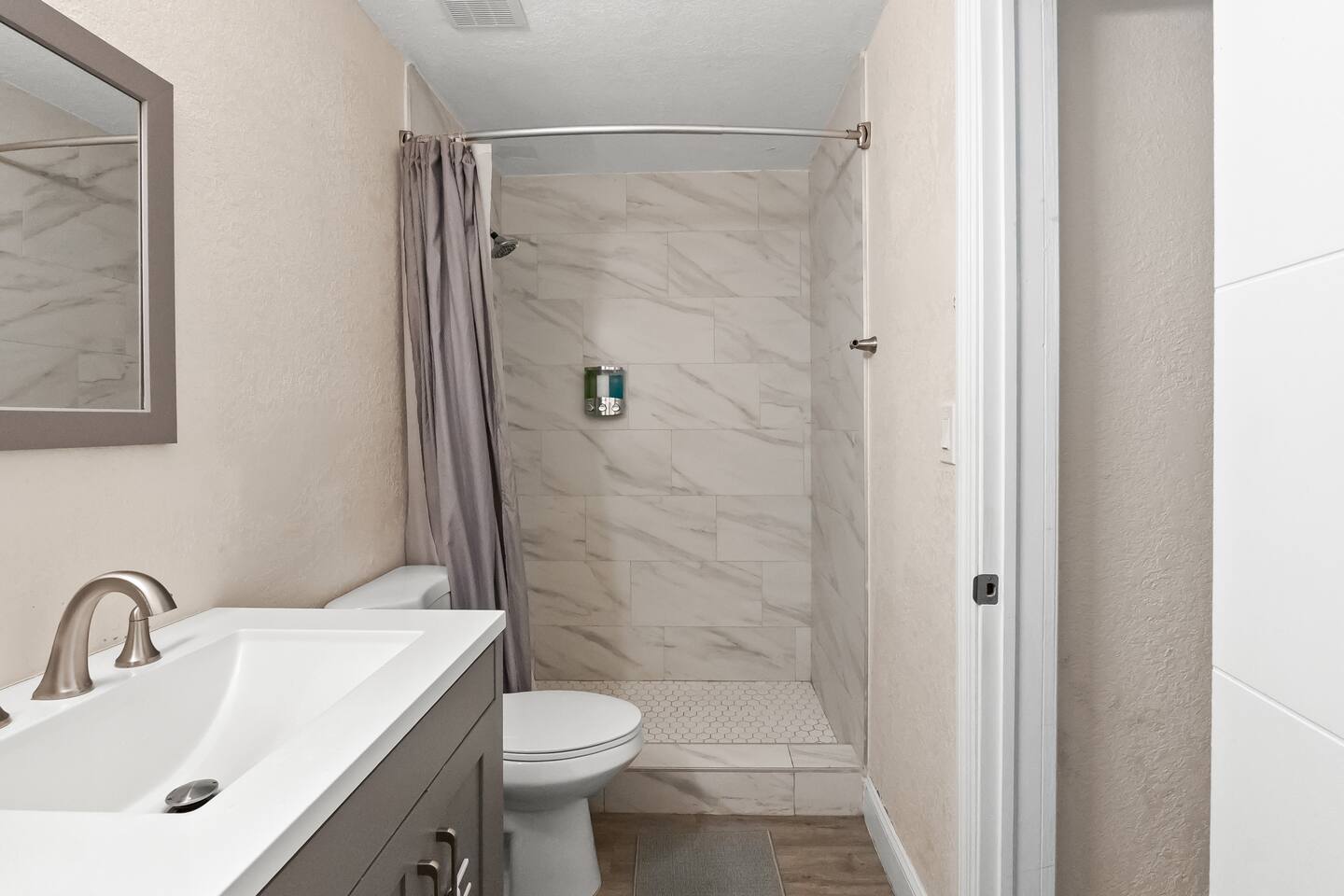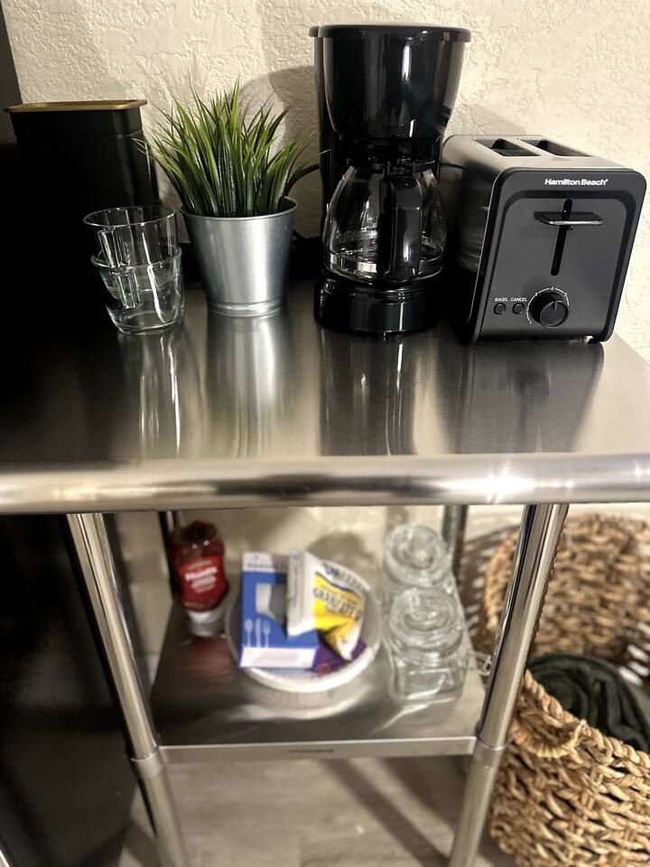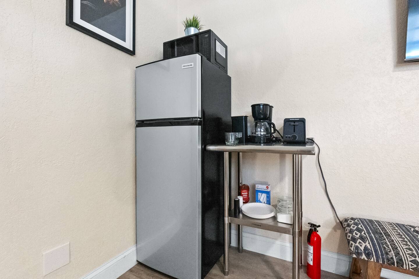 SLEEPING & COMFORT: - Comfortable Queen-sized bed - Twin-sized air mattress available upon request - Individually controlled, quiet air conditioning unit KITCHENETTE & DINING: - Kitchenette with refrigerator, microwave, and toaster - Coffee maker with complimentary coffee & tea - Dining table for meals or work ENTERTAINMENT & WORK: - 50" Roku Smart TV for streaming your favorite apps - Fast, free Wi-Fi (337 Mbps) and dedicated workspace BATH & CONVENIENCES: - Full bathroom with a spacious walk-in tile shower - Hair dryer, iron, and ironing board provided - Pet-Friendly property